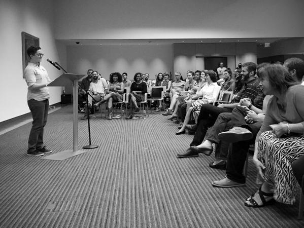 Po crowds and their wrinkled affairs. I go there dressed like I'm waiting to boogie, then have a pleasant, expensive, and tasty dinner afterward. A friend found this photo on the nut, of a poetry reading taken some time in the 2015 fall, and sent it my way. Looking at it I remember I'd just scratched my ankle. Looking at it I think again how easily I'm made happy. The person at the lectern has said something. Everyone else has heard it. Who else is gulping air like a lake fish? Right on; I knew that you could.